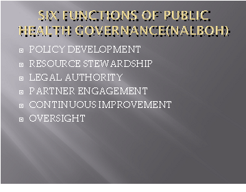 Third, boards of health have six functions which have been designated by the National Association of Local Boards of Health. The six functions are listed in the next table.