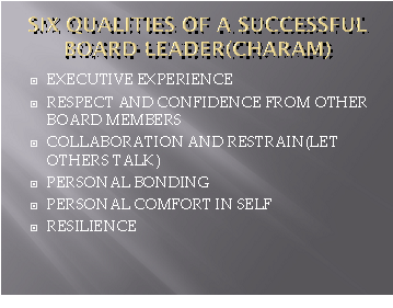 Finally, the characteristics of a board member as a leader has been discussed in detail by Charam and colleagues in the book “BOARD LEADERSHIP.”